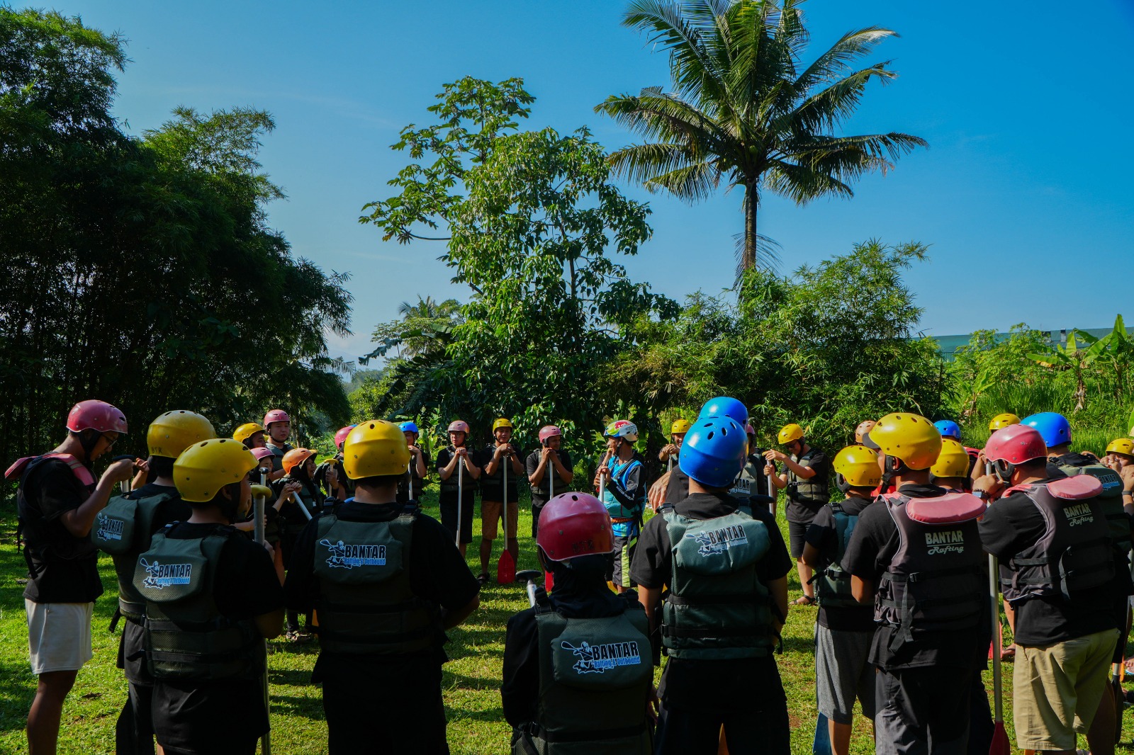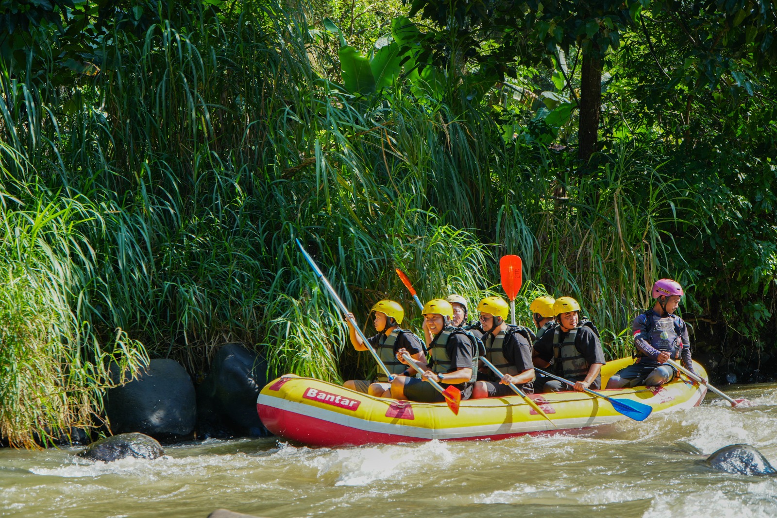 - Rafting Setelah briefing keselamatan, peserta akan menerima perlengkapan rafting seperti rompi pelampung, helm, dan dayung, serta wajib mengikuti instruksi dari instruktur. Setiap perahu dipimpin oleh satu instruktur, dan peserta perlu bekerja sama mendayung serta menjaga keseimbangan agar perahu dapat melaju dengan baik. Jika terjadi hal yang tidak diinginkan seperti tergelincir, tidak perlu panik karena tim keselamatan akan selalu siap membantu.
